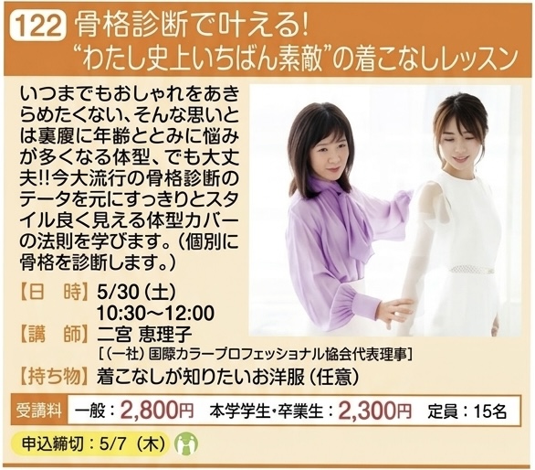 一般社団法人国際カラープロフェッショナル協会代表理事二宮恵理子が19年間続く大阪学院大学 生涯学習講座でこの春も人気3講座開催が決まりました。