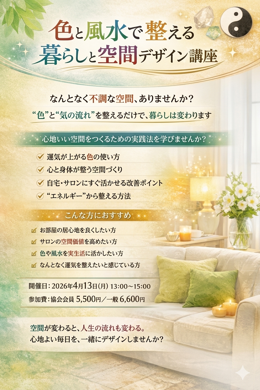 色彩の持つ力と風水の知恵を組み合わせることで、ご自宅はもちろん、サロンやお仕事の空間にも活かしていただける内容となっております。