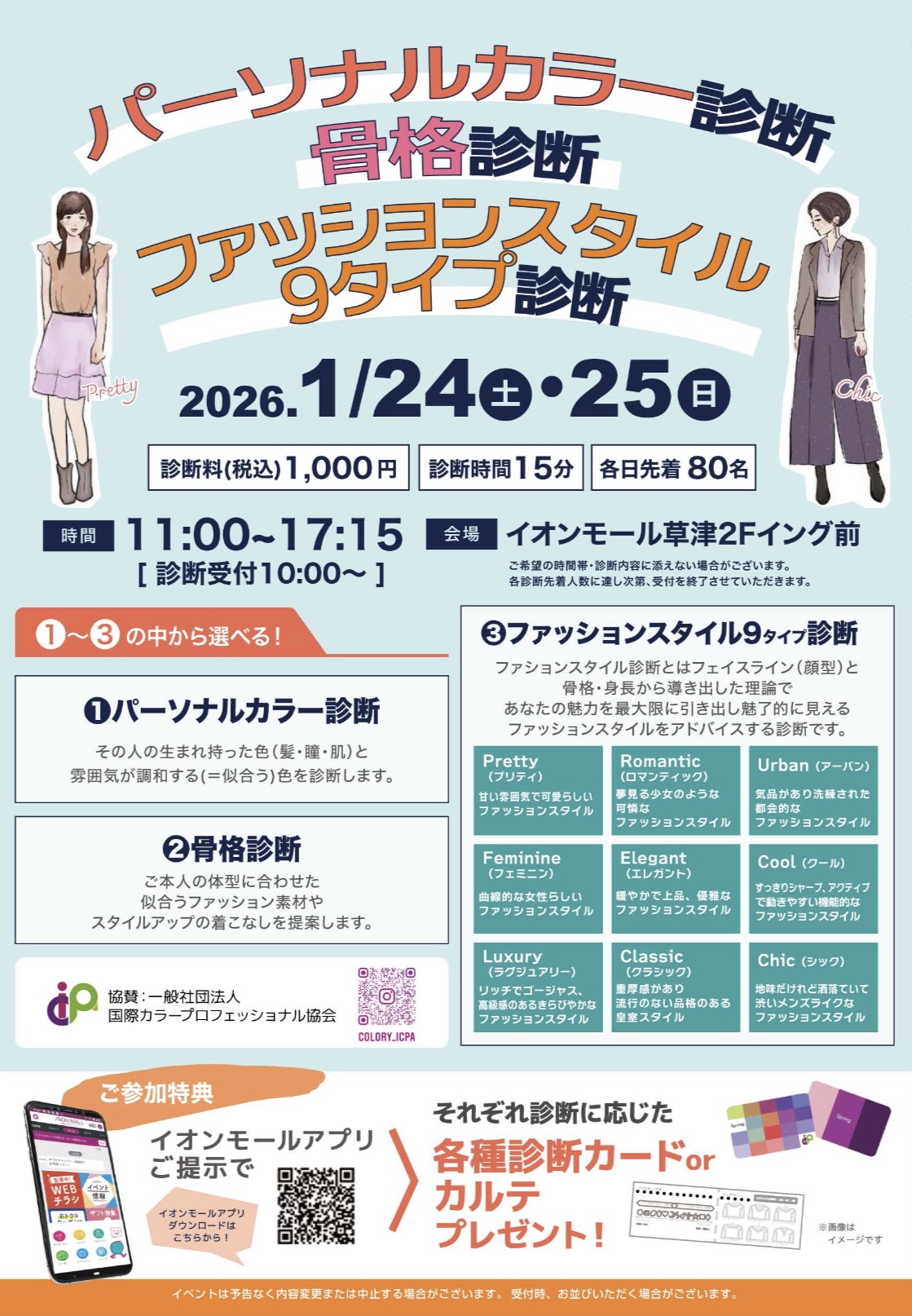 イオンモール草津にて「パーソナルカラー診断」「骨格診断」「ファッションスタイル診断(9タイプ)」を開催します。あなたに最も似合う色やスタイル、ファッションの方向性をわかりやすく診断します。